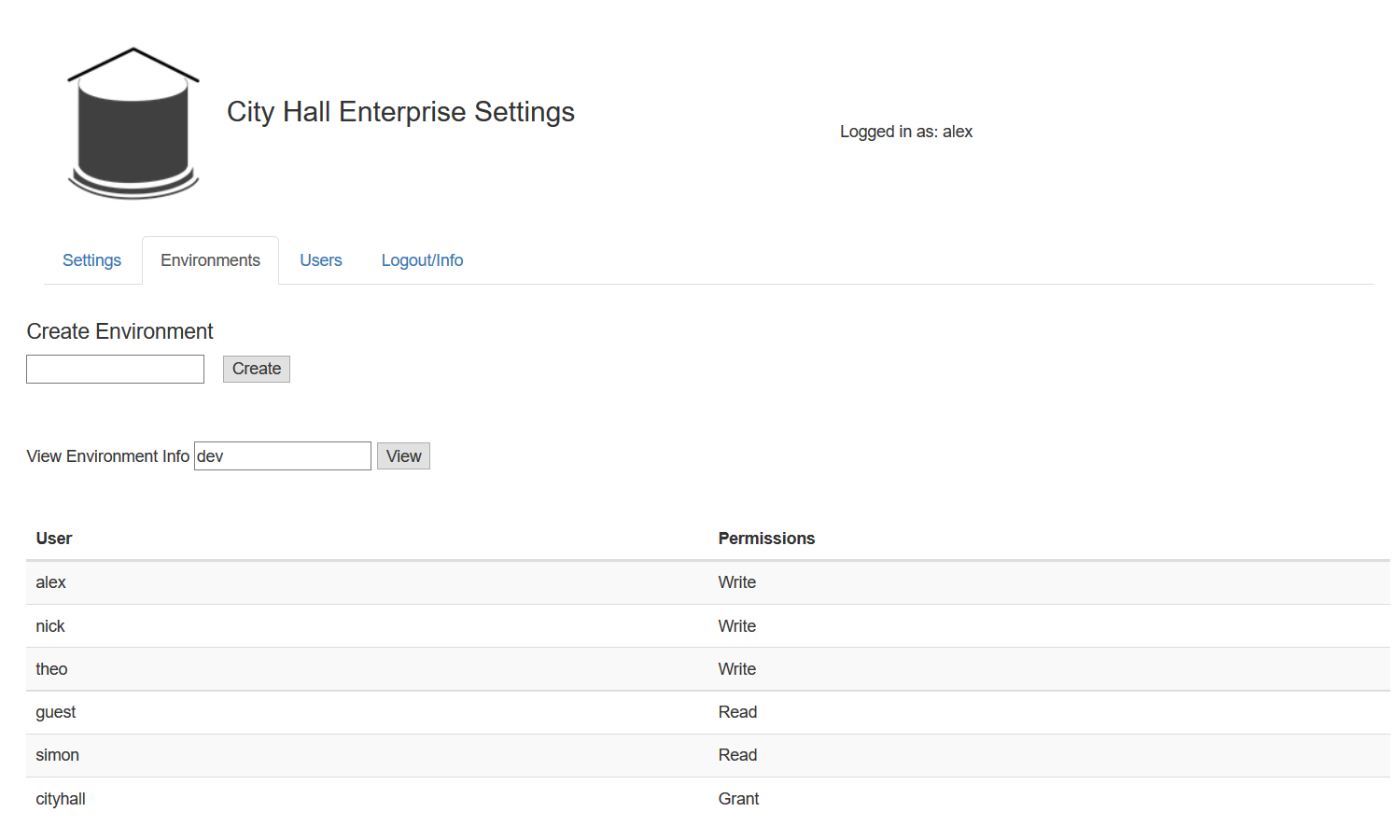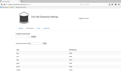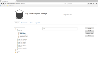 City Hall is a tool to help organizations manage settings. This means giving everyone in the organization access to a set of tools which addresses their concerns. Business will want a simple website to administer settings for production, including things like an audit trail and permissioning. Quality assurance will want a way to maintain multiple versions of the settings simultaneously with the ability to easily switch between sets of related permissions. And, finally, development will want a simple tool which will associate a human-readable string to a setting, regardless of the environment it is running on. City Hall is all of these things in one thin, light weight package. |