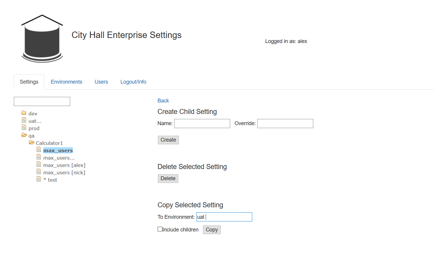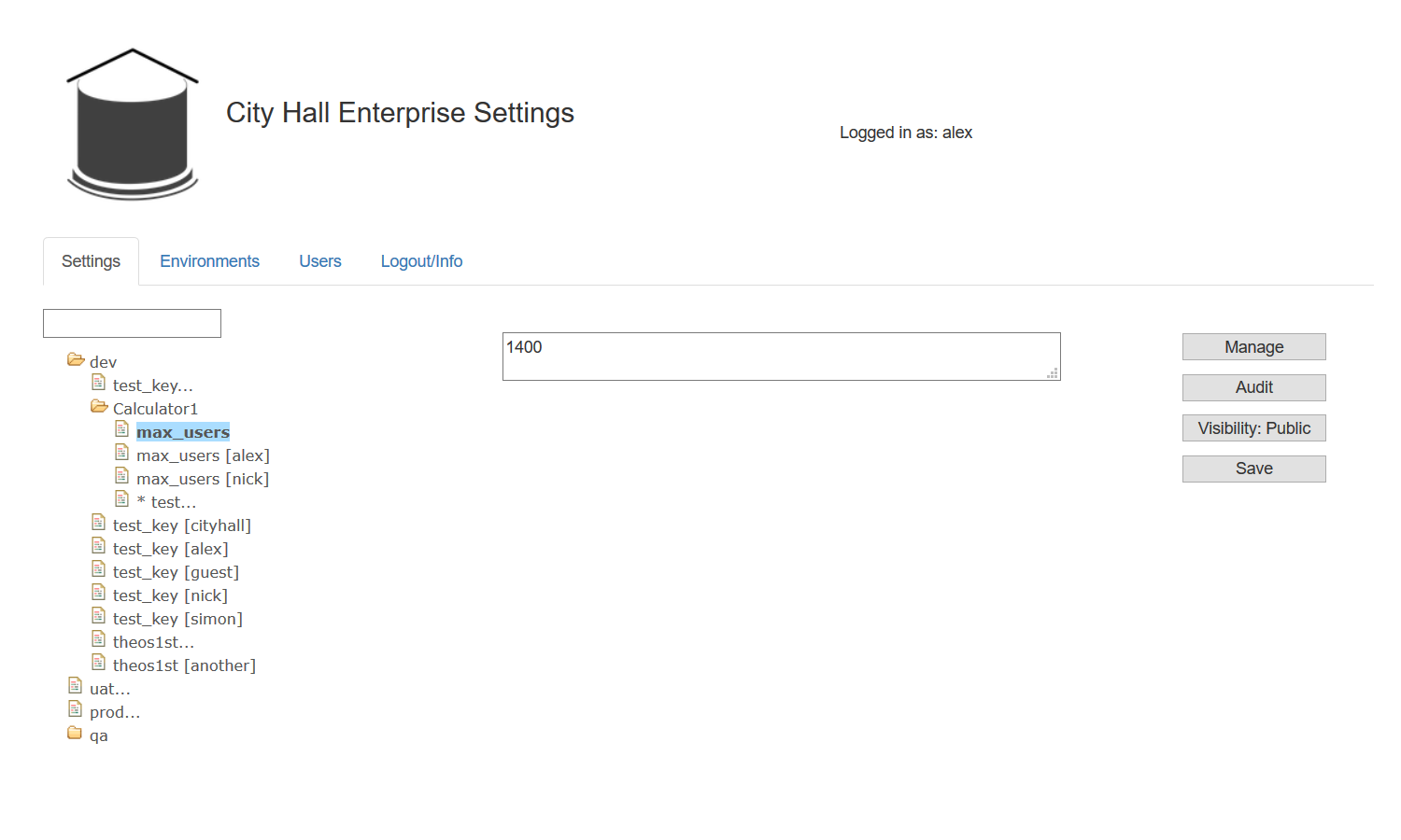 Here, City Hall has an answer to each of the sample settings. It introduces the concept of environment/key/value store, where each environment has essentially the same keys, but the values may differ. It supports users with read, read-protected, write, and grant permissions on a particular environment, and a simple web page to manage everything. It can work with your existing database, and your existing language, significantly cutting down on the technical debt you might incur. It has a strong audit trail for everything that happens to a key. It moves management of business settings into the hands of business.